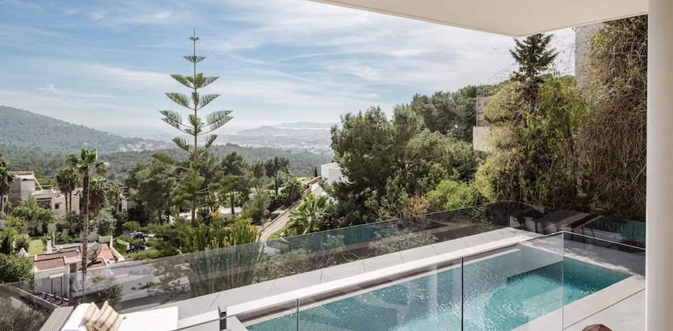 Villa Lagarto has both a private intimacy with its jaw-dropping views of the island and sea while being close to the nightlife Ibiza is known for. Its floor-to-ceiling sliding doors seamlessly merge the indoor and outdoor spaces and bring in tons of natural light. This villa also has an impressive array of artworks and designs installed throughout the property. Additionally, there is a state-of-the-art wine cellar and a home cinema included in the villa. Outside you have a curved pool, a large sunny terrace, a hot tub, and dining space. This villa has four bedrooms and six bathrooms making it ideal for eight guests at 49,525 euros a week.