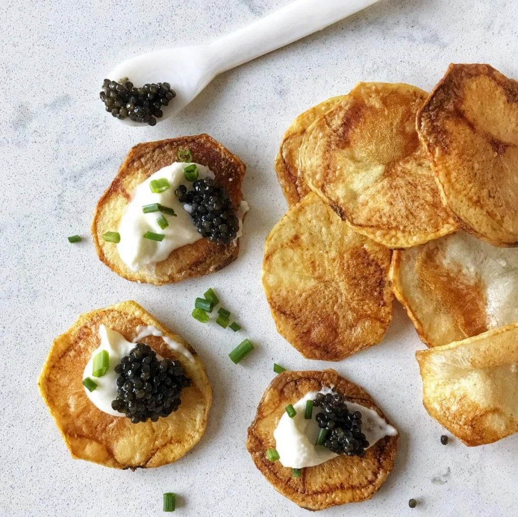 I love this recipe because it makes a statement that you have good taste, but know how to go high-low. What I mean by that is the caviar is obviously the high, and the low, though brilliantly low brow, are the potato chips from CVS. Yes, you read that correctly; some of the best potato chips are the CVS Gold Emblem brand. They are not always easy to come by, but I do my rounds of the CVSs until I find these chips. They’re sturdy thick chips, but they also taste amazing.