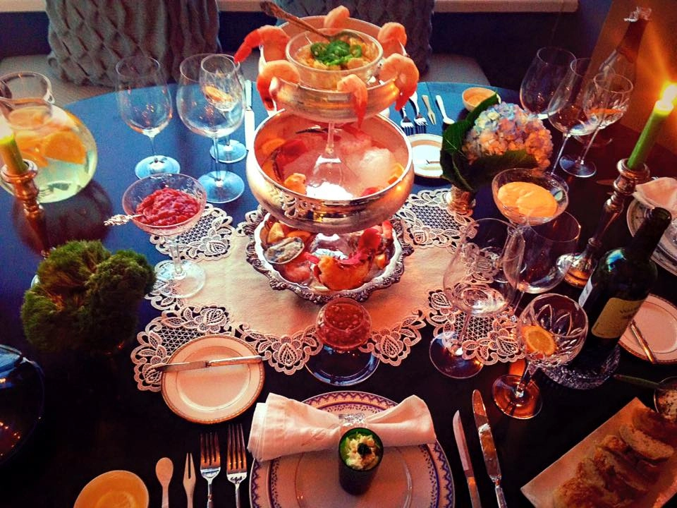 This is another quick assembly project, where presentation is everything. Take a beautiful silver dish and pack it with crushed ice. Separately finely chop the avocado, and mix in with the lump crab. Add in the jalapeño to taste. Give the crab avocado mixture a little squeeze of lime and place in a clear small bowl in the middle of the silver dish. Artfully arrange the lobster tails and shrimp on the silver dish over ice. Serve immediately with the cocktail, mustard and hot sauces on the side.