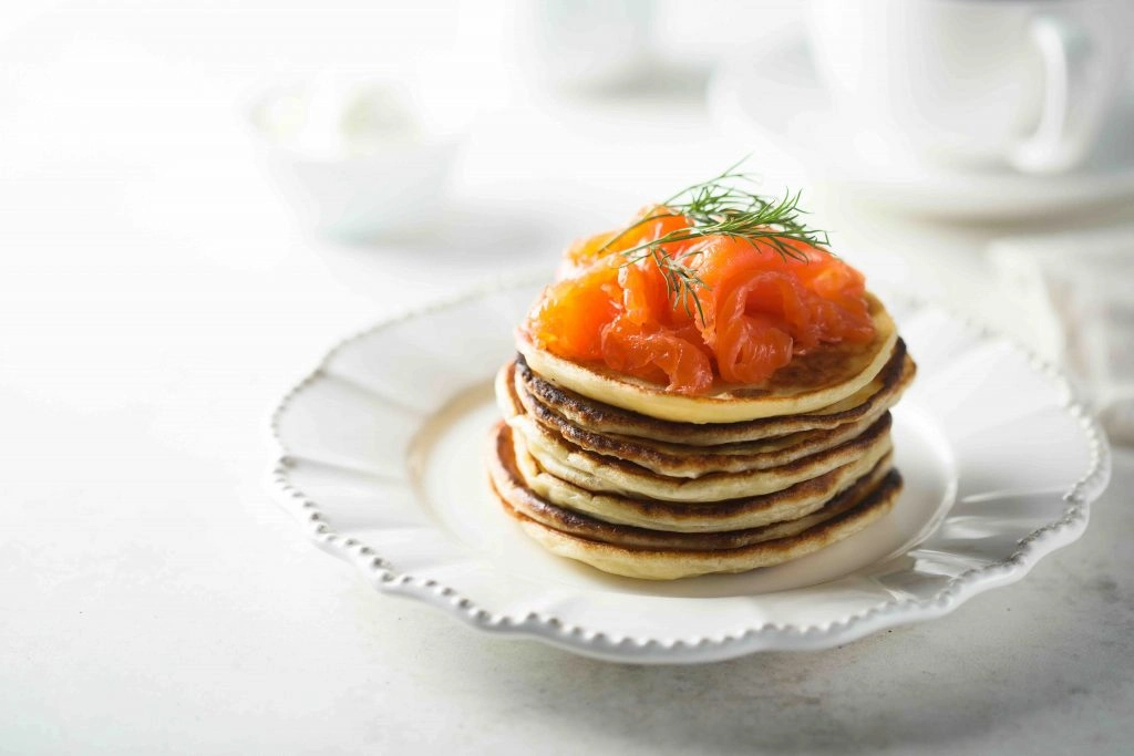 Cut the smoked salmon into 1 1/2 to 2 inch squares. Create a rosette by folding the bottom of the salmon up about 1/3 of the way, and then roll it until you have a rose. Place each rosette in the middle of a blini. Dab with a small amount of creme fraiche and a few chives and serve.