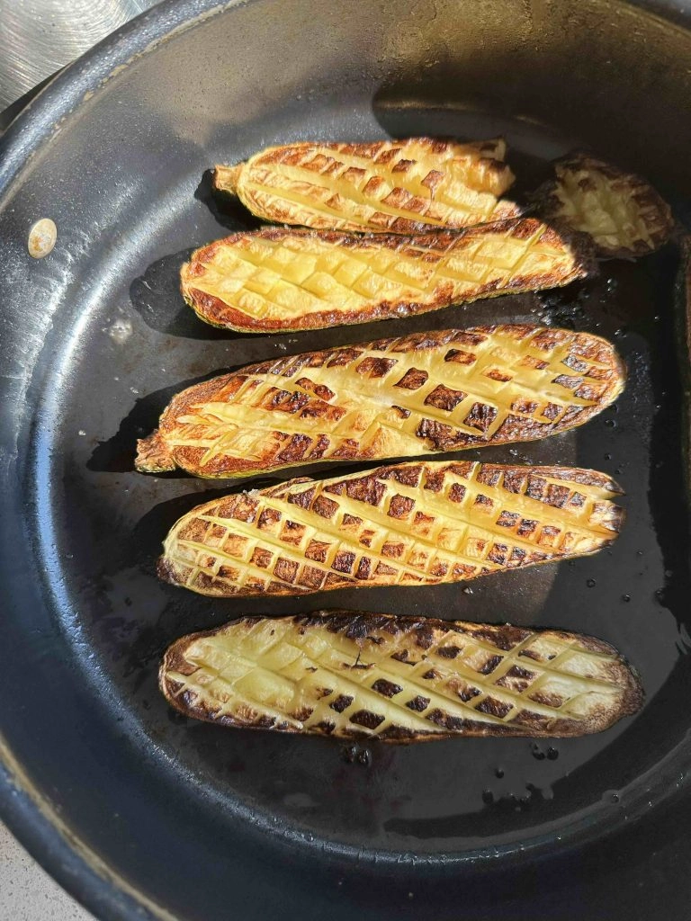 Rinse your zucchini well and drain in a colander. Cut the zucchini lengthwise in half. Gently score the zucchini diagonally in one direction; score the zucchini in the opposite direction so that it’s in a criss-cross pattern.