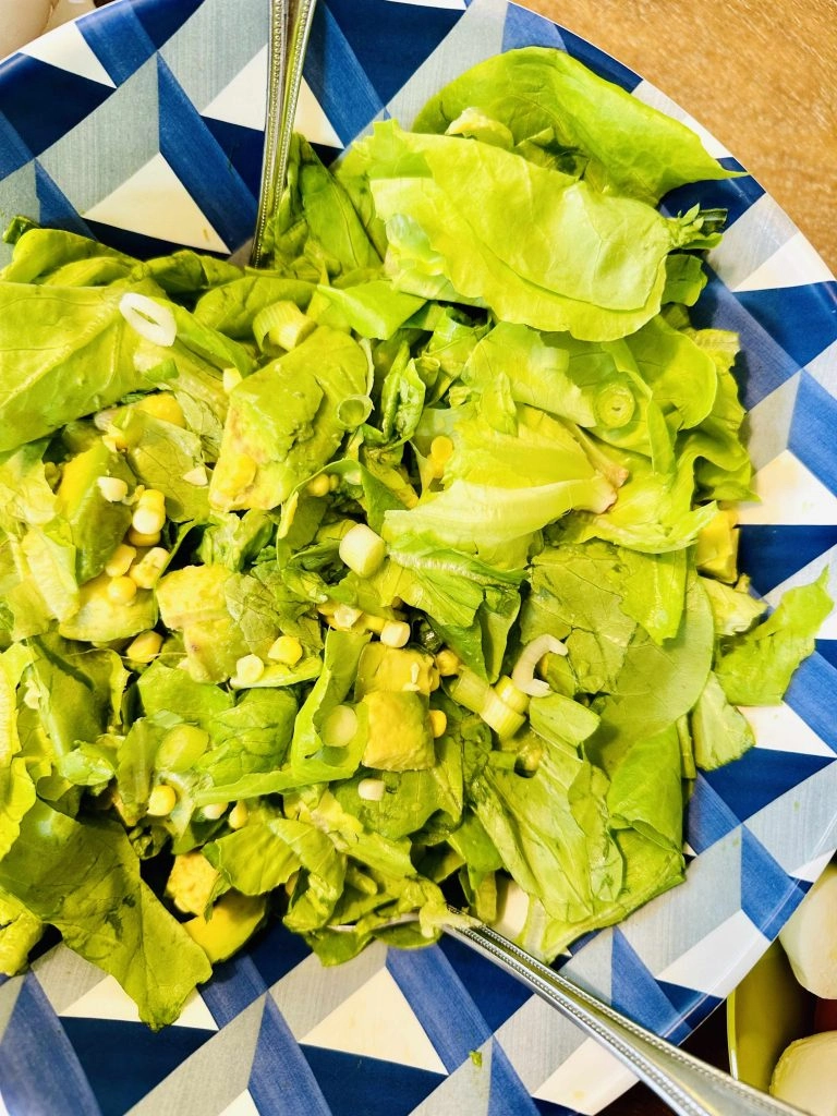 Tear the butter lettuce into bite-sized pieces and place in a large salad bowl. Next cut the corn off the cobb and sprinkle on top of the butter lettuce. The last part to this summer salad recipe is to cut the avocados in half and dice the avocados. Place on top of the salad and squeeze some Meyer lemon on top so the avocados don’t brown. Lightly sprinkle with Maldon sea salt. Add in the protein of your choice on top and for a heartier but still healthy salad, Israeli couscous.