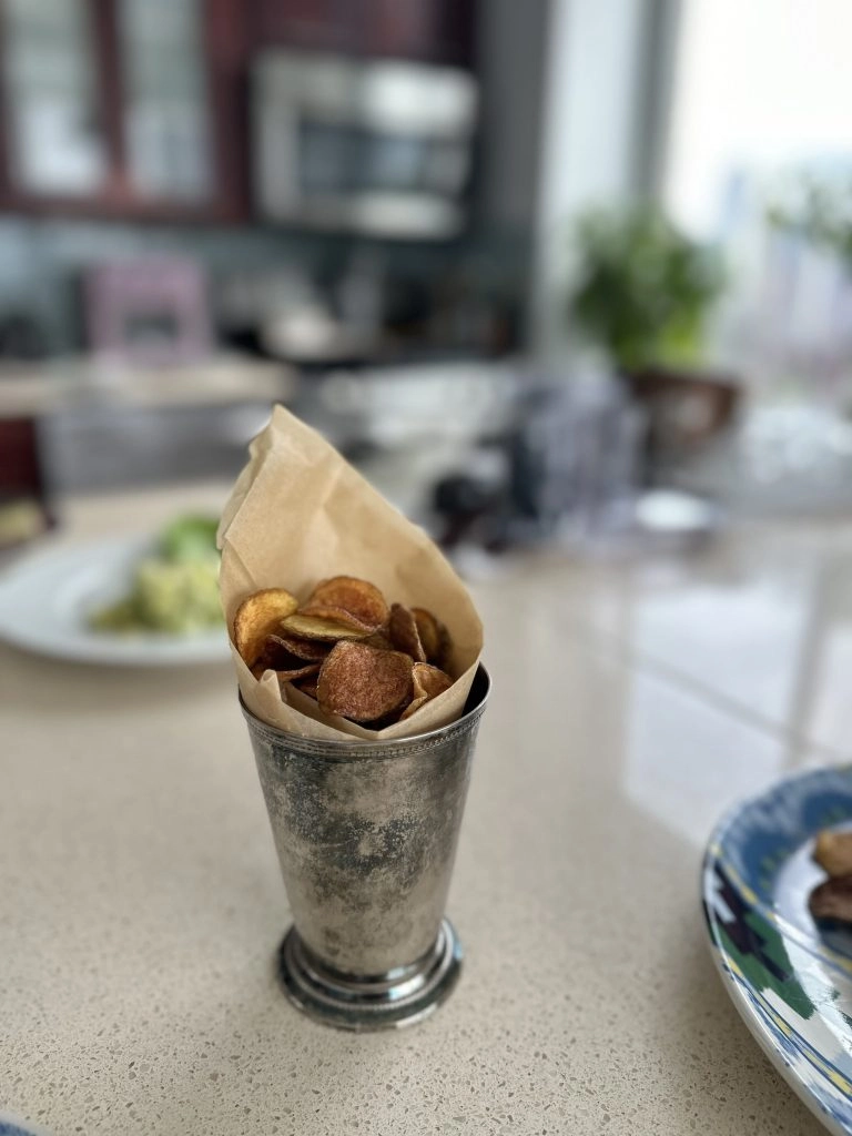I have two major weaknesses in life. On the high-brow side, caviar is my favorite food. It’s not like I grew up eating caviar. However, once I got the taste for it, the good life opened up to me. But the second on my list of weaknesses is something that’s as American as can be, and was my favorite food growing up: the potato. I will take a potato in any form, shape, preparation, or dish. I’ve never met a potato I don’t like. As I’ve gotten older though, and my metabolism no longer supports a cheese-fries-for-lunch diet, I’ve had to limit my potatoes. Therefore, at home, spuds are often on their last leg when I give in to make them into a dish. That’s how I came up with this homemade potato chip recipe, which of course I shared with friends.