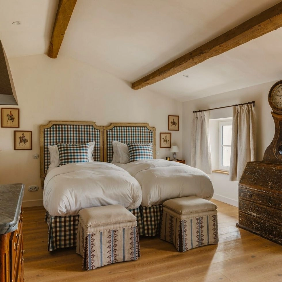 Maison Dubreuil is exactly what you’d expect from a renovated farmhouse in rural France. It’s elegant, charming and filled with traditional architectural and decorative elements such as stone walls, parquet floors, large fireplaces, light-blue shutters, antique furniture, and more. In short, if you’re looking for a high-tech, modern house, you need to pass your way. This one is for travelers who want an authentic, steeped-in-French-culture experience. That said, there are contemporary amenities on site, including a pool and a fully equipped gym.