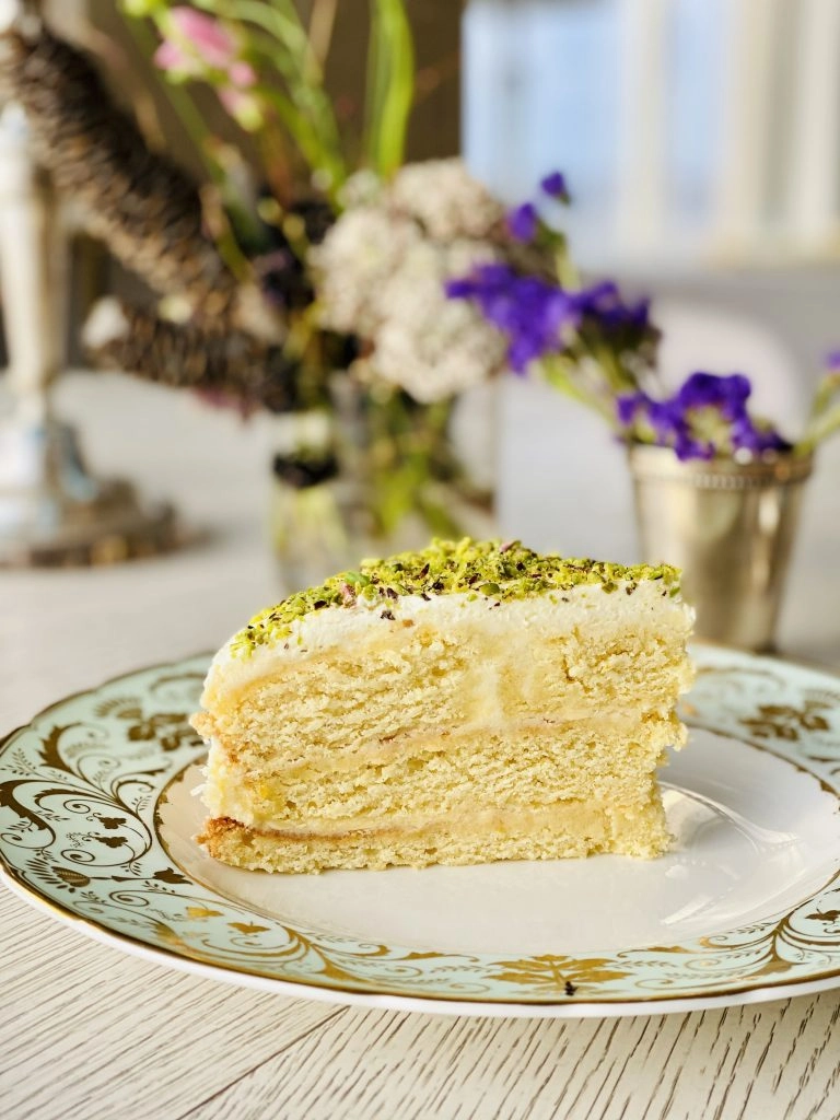 Lastly, this was out of necessity because homemade cakes, unless you do this professionally, don’t always look beautiful. Our solution to this real-life problem was to add pistachios that are finely crushed from Bronte. This takes the lemon layer cake recipe to the next level both taste-wise and aesthetically. Pistachios from Bronte have an intense flavor and bright green color.  It is s a gorgeous compliment to the yellow and white of the cake. Functional and beautiful – you’ll like it.