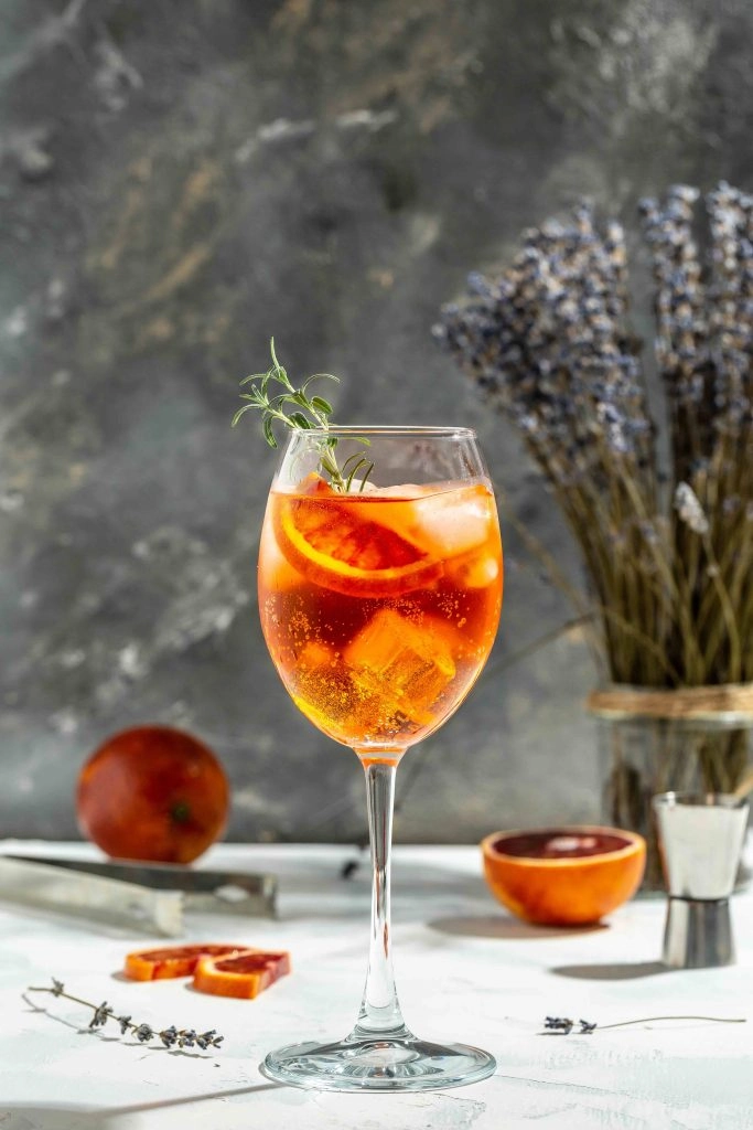 This is one of our favorite mocktail recipes for summer time. Using a jigger, pour 1.5 oz of Seedlip Grove 42 (Non-alcoholic spirit) into a rocks glass. Add .5 oz of Giffard aperitif syrup (non-alcoholic Campari). Add six dashes of lactic acid solution (one part of lactic acid powder diluted in nine parts of water). Fill the glass with cubed ice and mix all the ingredients together. Top off with Fever Tree Light Tonic and add a mint bouquet and half moon orange as garnish.