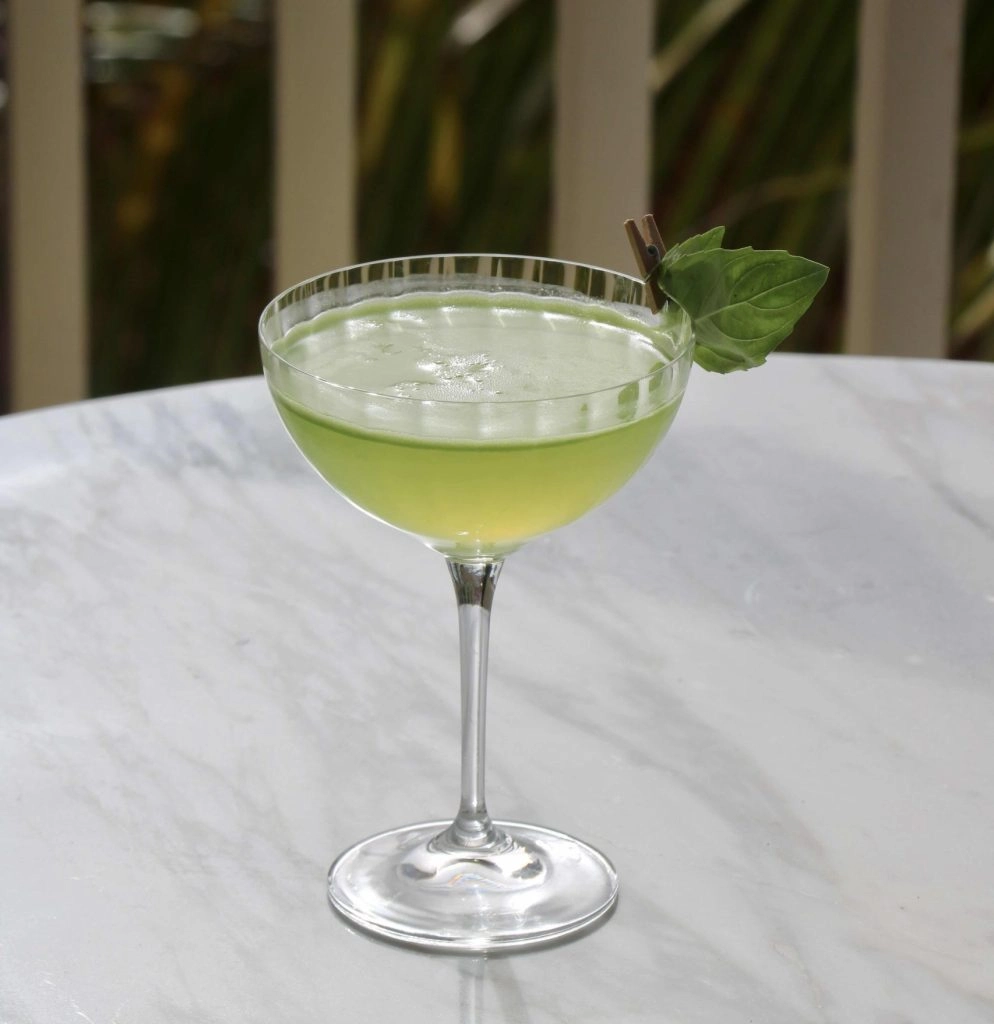 This is one of the most refreshing mocktail recipes that you can drink any time of the day. Pour all ingredients into a mixing glass, add ice cubes and shake well. Strain and pour into a coupette glass and garnish with two basil leaves.
