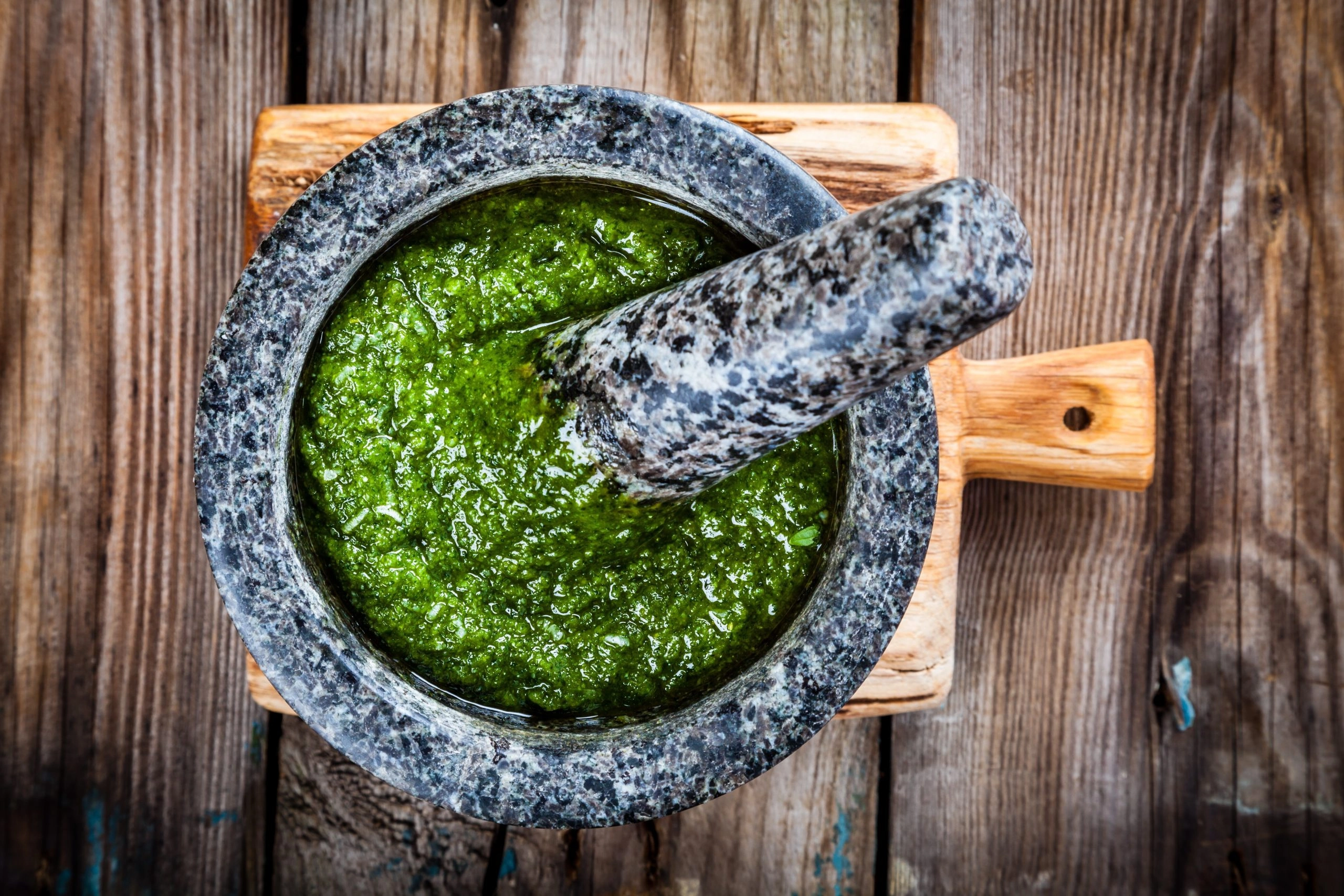While your stock simmers, you can get started on the pesto. Although you can easily make this using a food processor, pesto is derived from the Italian word for “pound” or “crush.” So, for the sake of tradition, we recommend using a mortar and pestle. It takes a little elbow grease, but the result is worth it.