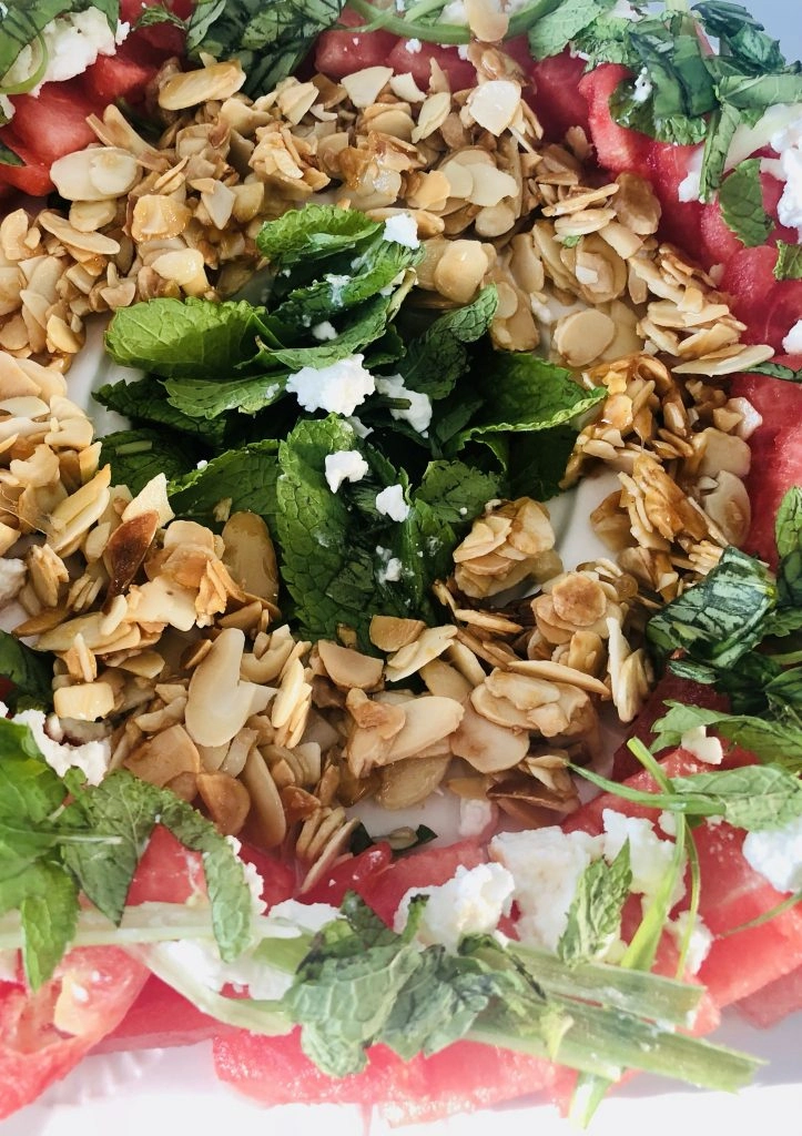 To assemble the salad, place the cubed watermelon and cucumber in a large but shallow salad bowl. Pour over the dressing, tossing to coat the fruit evenly. If you’re using fresh herbs, roll both the basil and mint between your hands for a few seconds to bring out the flavor. Tear into small pieces and sprinkle over the salad. Top with green onions, feta, and fried shallots.