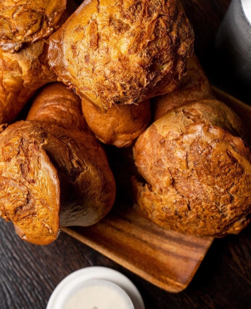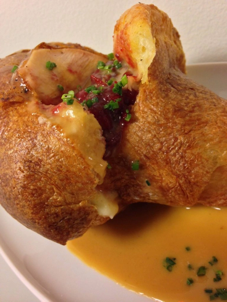 Create an assembly line of your leftovers, placing the pots of the mashed potatoes, sweet potatoes and cranberry right on the countertop. The Brussels sprouts and salad should be place in nice serving dishes too. The popovers can be placed in a large bread basket and covered with a towel to keep them warm. This makes for the perfect open house brunch for guests to make that perfect Thanksgiving leftover sandwich. We would say this is the most classic of the Thanksgiving leftover recipes you can make this season. We’ve known family members to even make these for a second round of food the day of Thanksgiving. Either way it’s a crowd pleaser.