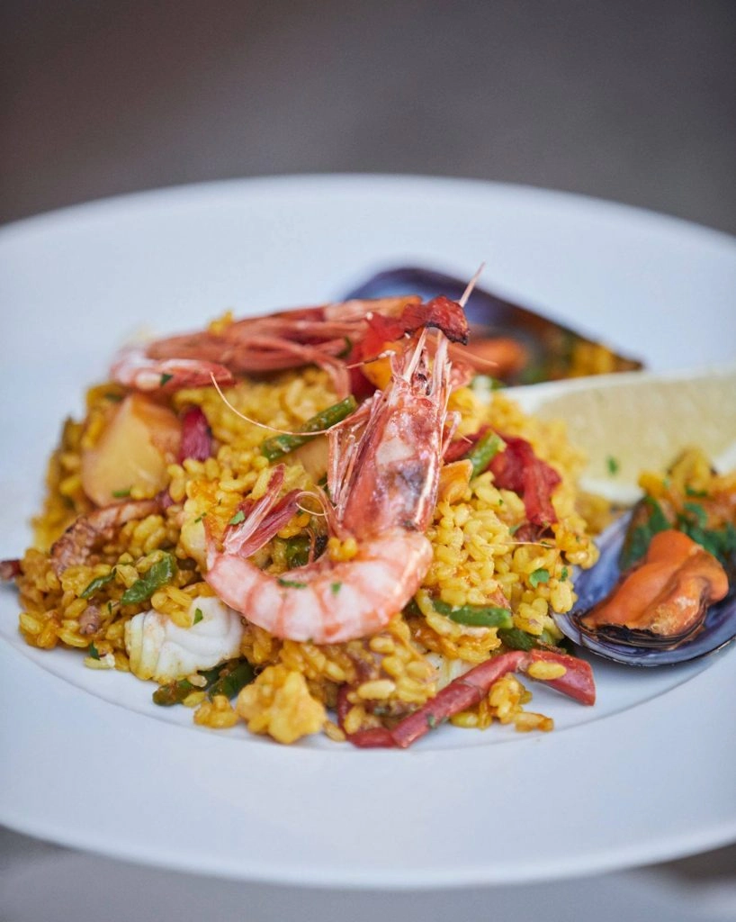 Traditional paella has peas and garlic, and if you’re going old school Valencia-style, chicken as well. Often in Spain, your shrimp will have the head and shells on. However, in my seafood paella recipe, the lobster tails are halved and the shells have come off the shrimp: no hands required. If you want to use your hands, I won’t judge.