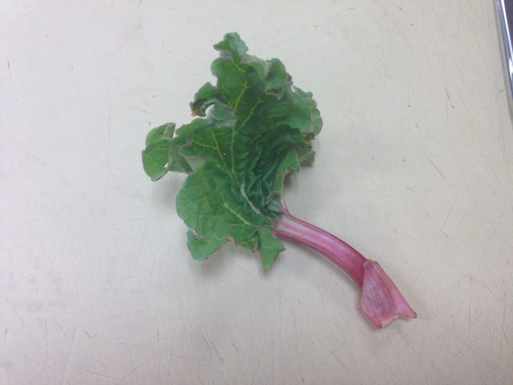 On your serving plate, thinly slice your stalk of rhubarb into almost transparent slices.You shouldn’t see or buy rhubarb with the green leaves still attached, but if you do, immediately discard them. Those things will give you a food-poisoning-like stomachache that you won’t soon forget. Believe me, you only want the stalk: the edible part of the rhubarb.