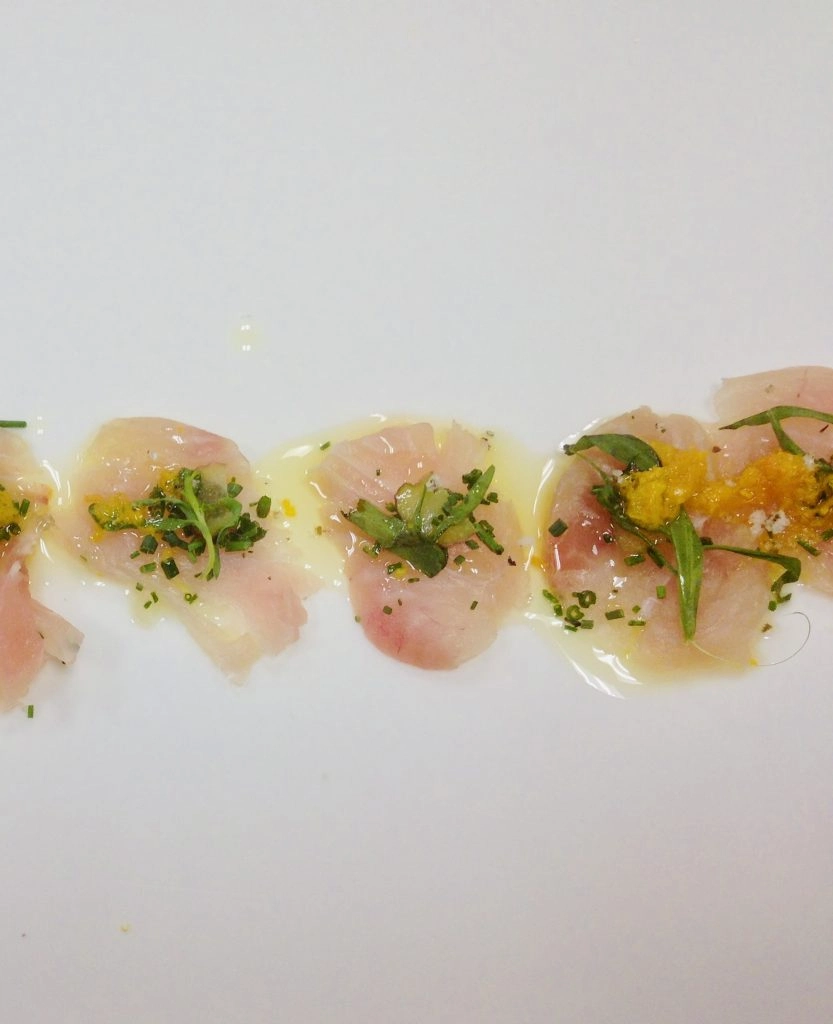Place the sashimi filets in a circular pattern with about one-inch gaps in between, and sprinkle with Maldon sea salt to taste. Next, top with small mounds of the sliced rhubarb, and garnish with micro-greens. In the one-inch gaps, place a small slice of the supremed orange, with a delicate mound of shaved fennel. Like the rhubarb, the fennel should be sliced so thin that it’s translucent. With a microplane, zest about 1/4 peel of the orange on top of the sea bass. Drizzle with olive oil and enjoy.
