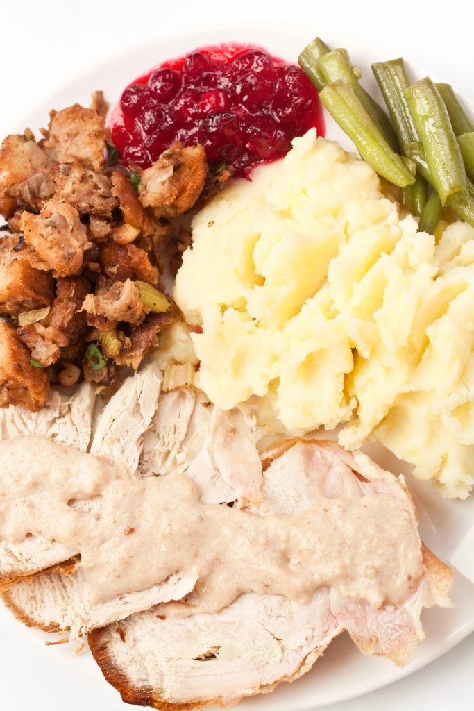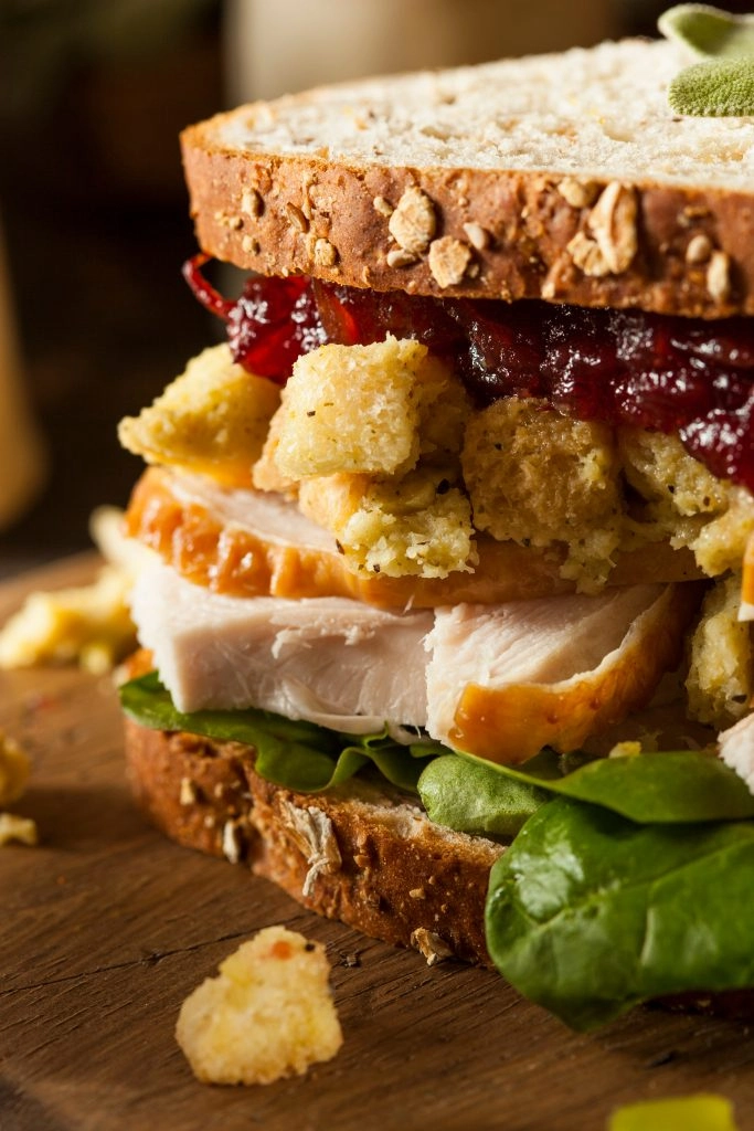 To assemble the sandwiches, spread your desired amount of cranberry mayonnaise on each slice of bread. Divide half of the turkey and gravy mixture evenly over four slices, then divide the leftover warm mashed potatoes on top of the meat. Top each sandwich with a slab of the fried stuffing, then add the remaining turkey and gravy mixture. Finish each sandwich with the remaining slices of bread, slathered in cranberry mayonnaise. Cut using a sharp serrated knife (preferably on the diagonal) and serve right away. For even more fun, serve with a side of gravy to dip your sandwich in.