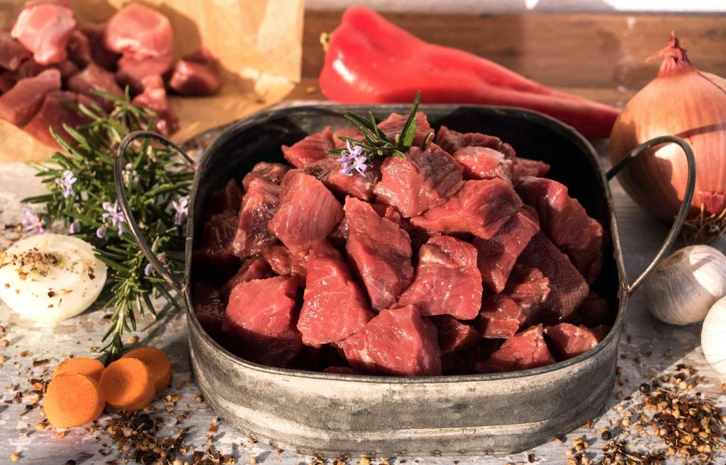 In a large Dutch oven, preferably cast iron with a heavy lid, heat about three tablespoons of olive oil over high heat. Remove your cubed beef from the bag and discard the marinade. When the oil is hot enough that a drop of water sizzles in the pan, sear your beef in batches, about one minute per side. This will brown the beef and seal in the flavor. Remove from heat and cover in a bowl so the juices don’t evaporate.