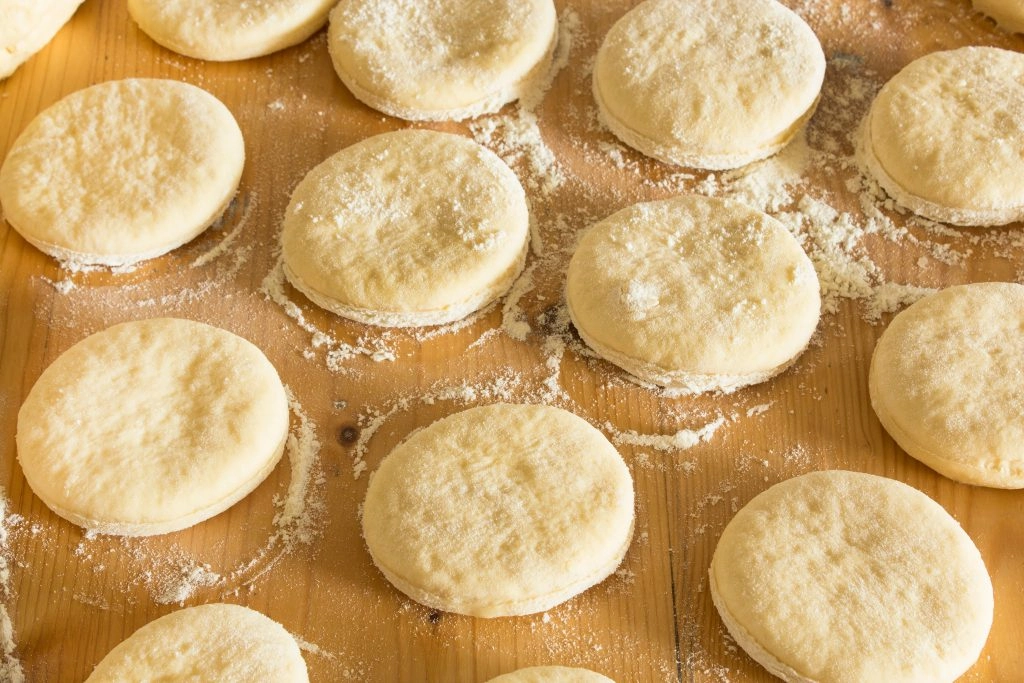Dip a cookie cutter into flour. Beginning at the outer edge of the dough, press the cookie cutter down firmly and twist slightly to cut the circle. Scoop each circle out with a spatula and place them on the baking sheet. Once you’ve run out of room on the dough, re-roll it into ½ inch-thickness. Repeat the process until the dough is gone.