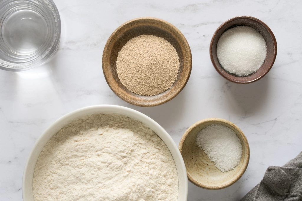 In a medium mixing bowl, whisk together the active dry yeast, a ¼ cup of lukewarm water, and 1 tablespoon of granulated sugar. Let sit for 10 minutes, allowing the yeast to expand and become foamy.