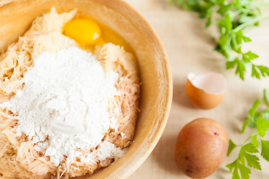 Once your potatoes and onions are as dry as possible, transfer the mixture to a large bowl. Add the eggs, flour, salt, baking powder and pepper, and mix until well combined.