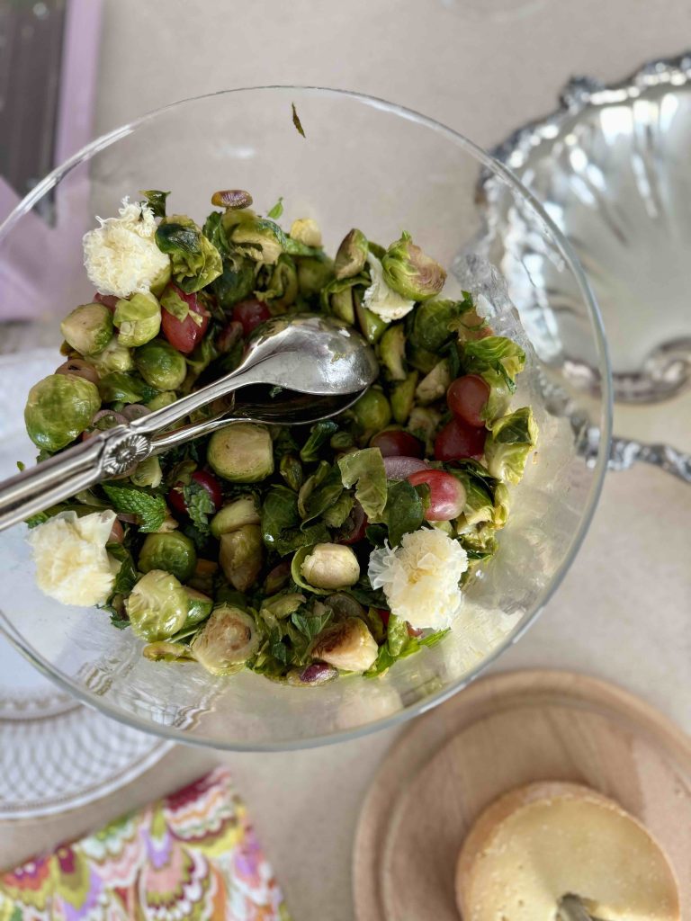 Now it’s time to assemble the salad. The purple color of the grapes will enhance the visuals with the green Brussels sprouts, and toasting the pistachios adds a crunch to the dish. In a large clear bowl, toss the Brussel sprouts, grapes, mint and pistachios together. I like to use a trifle dish, which will highlight the colors and presentation. After all, sometimes you have to make the healthy Thanksgiving dishes more attractive to the crowd. Add a drizzle of olive oil and sea salt. Arrange a few of the Tête de Moine rosettes at the top of the dish and center of the bowl. Add your wheel of Tête de Moine with your girolle on the side for guests who want more cheese.
