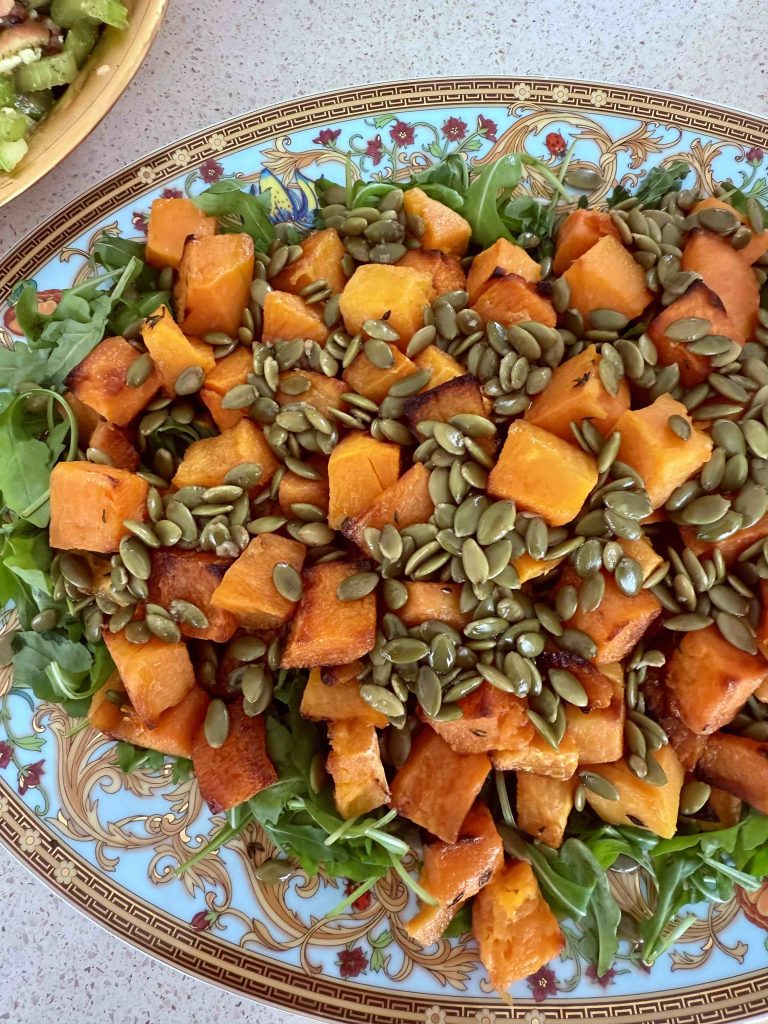 In a large flat serving platter, spread the arugula, then top with the roasted butternut squash. Add the pumpkin seeds on top. Serve with the dressing on the side for those picky eaters. Enjoy!