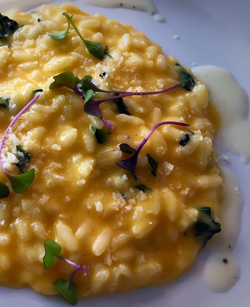 This is not just a tip for this pumpkin risotto recipe; it’s for all risottos. Begin adding your warmed chicken stock, about ½ cup at a time as the liquid reduces into the rice. Risotto requires more attention than a baby – this entire time you need to stir. Continue for about 15 minutes, adding ½ cup each time, as the rice becomes thick and creamier. Add in the pumpkin puree and sherry at about 15 minutes. At about 17-18 minutes, add in the parmesan. Continue adding the stock, ½ cup at a time until the rice is firm but cooked. The consistency should be thick liquid, as the rice will soak up the stock as it sits and continue to cook. Risotto should be served immediately in shallow bowls, piping hot. Garnish with mircogreens or edible flowers, a drizzle of olive oil and more parmesan to taste. This is a pumpkin risotto recipe you will want to put in your standard rotation this fall.