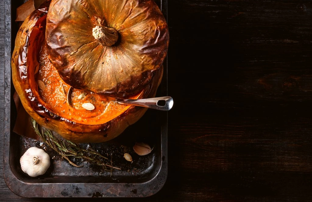 Use a sharp pairing knife to cut around the outline of the pumpkin stem, cutting a large enough hole to reach inside. Remove the stringy interior and discard. Bonus points if you save the seeds to roast for a salad or baking project.