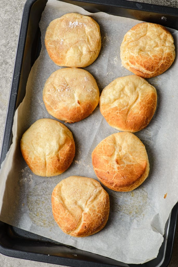 Oil your hands and scoop out 2 tbsp proportions at a time, rolling them into balls and arranging them on a baking sheet about 2 inches apart from each other. Bake for about 30 minutes or until fluffy and golden brown.
