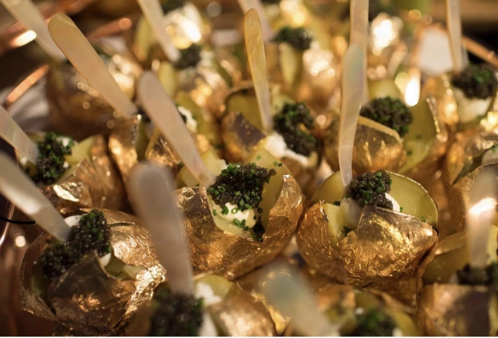 First, pop your mini potatoes in the oven at 350 for 20-25 minutes. When they look cooked to your liking, allow them to cool off before beginning the gilding process. Take a small clean paintbrush and apply a thin layer of water to the outside of the potatoes. Then apply the gold foil, being careful to touch it as little as possible. Then cut each potato in a cross shape, creating a well where the caviar can sit. Finally, add a drop of crème fraîche to the cross cut. Top that with dill and caviar. Serve warm to your celebrity guests.