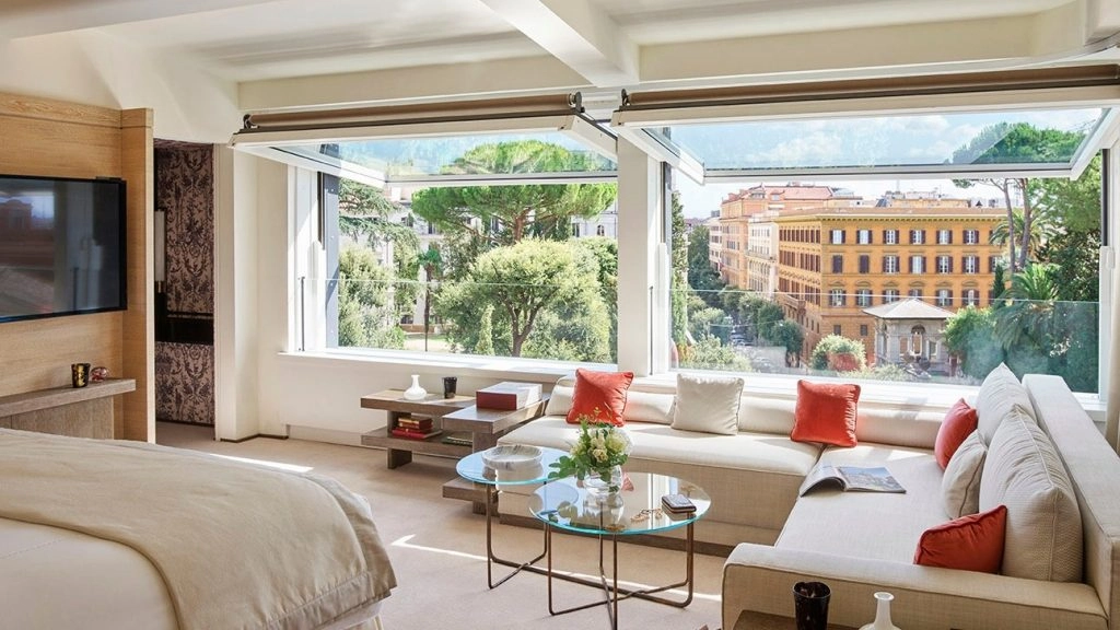 The Hotel Eden is the most luxurious Grande Dame Hotel in Rome. When Hotel Eden opened on October 10, 1889, they were the first hotel in Rome to feature a lift, electricity, heating and running water. Today, Hotel Eden is an iconic institution with luxurious rooms, a spa and one of the best rooftop views in Rome for sunset.