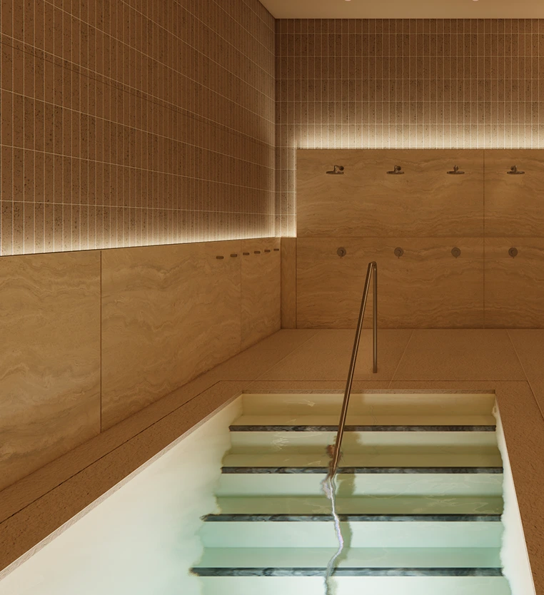 Though Studioilse helped with the club’s conception, interior design firm Ringo Studio brought the designs to life. Inspiration stems from contrast therapy itself, using shifts in textures and materials to mirror the bathing circuit. Slippery travertine limestone is juxtaposed with textured brick and soft cream shades, balanced by darker, woodier earth tones.
