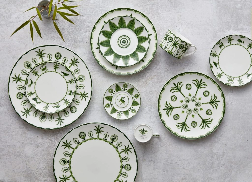 SONA Home’s debut dinnerware collection is Sultan’s Garden. The color palette’s earthy green acts in contrast to stark white. Early near-Eastern ceramic artwork is the inspiration for the pieces in the Sultan’s Garden collection. The designs that adorn the vessels for eating and drinking depict ornately detailed vegetation and animal life, including lions, turtles, and palm trees.