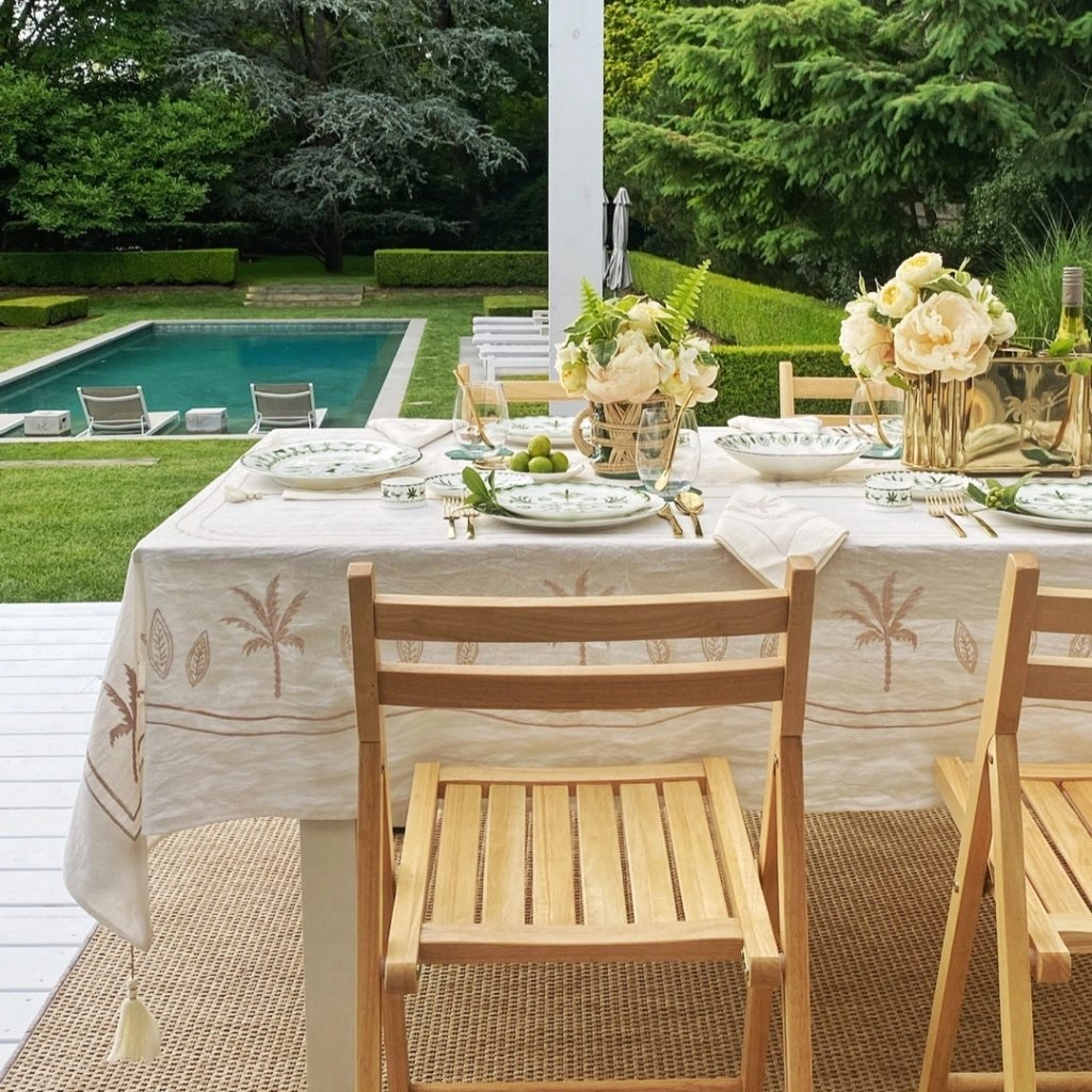 The collection’s linens are an assortment of placemats, tablecloths, runners, napkins, and lamps. The linen-cotton blend is designed in NYC in sea greens and blues, as well as Panna white. And they’re delicately embroidered with designs inspired by India’s beaches.